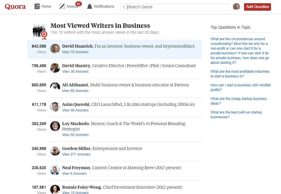 - All of this content helped make Quora a pop place. I got 5,000,000+ views in just a few brusque months. I was the summit viewed writer in a ton of categories, too, including Business, Wanting and Making Coin, and Entrepreneurship.